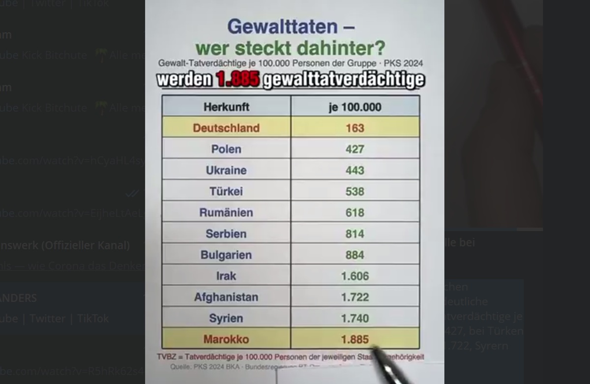 Ein Video zeigt die aktuellen Zahlen der Polizeilichen Kriminalstatistik 2024 – und die sprechen eine deutliche Sprache. Bei Deutschen liegen nur 163 Gewalttatverdächtige je 100.000 Personen vor. Bei Polen sind es bereits 427, bei Türken 538, Serben 814, Irakern über 1.600, Afghanen 1.722, Syrern 1.740 und Marokkanern sogar 1.885.